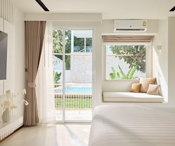 ห้องสตูดิโอ วิวสระว่ายน้ำและสวน ออกแบบห้องในโทนสีขาวทำให้ผู้เข้าพักรู้สึกอบอุ่น และผ่อนคลาย พร้อมด้วยสิ่งอำนวยความสะดวกครบครัน อาทิ ระบบความบันเทิงภายในห้องพัก, ระบบปรับอากาศ, สัญญาณอินเตอร์เน็ตไร้สาย, โทรทัศน์ LCD และสัญญาณดาวเทียม, อุปกรณ์ชงชากาแฟ, มินิบาร์, ตู้เซฟ, ไดร์เป่าผม, เสื้อคลุมอาบน้ำและรองเท้าเดินภายในห้อง และระเบียงส่วนตัวให้คุณได้ชมวิวบริเวณภายในโรงแรม